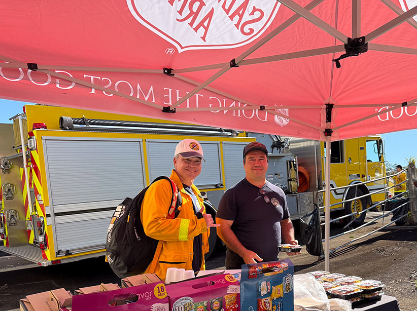 Firefighters working to contain the Manowaialeʻe Forest Reserve Brush Fire are receiving daily support from The Salvation Army Hilo Temple Corps. Beginning September 7, the Corps is serving breakfast, lunch, and dinner to 70 firefighters, with services continuing as long as needed.